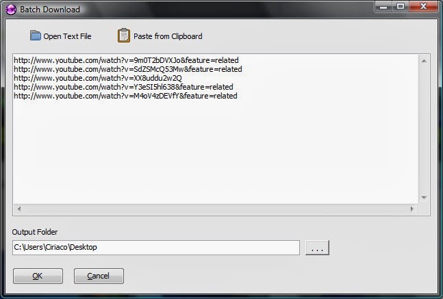 Insira uma em cada linha, copiando e colando manualmente ou então importe os endereços de algum arquivo de texto (formato TXT). Selecione também a pasta destino de todos os arquivos em “Output folder” e dê inicio ao download e à conversão clicando em “OK”.